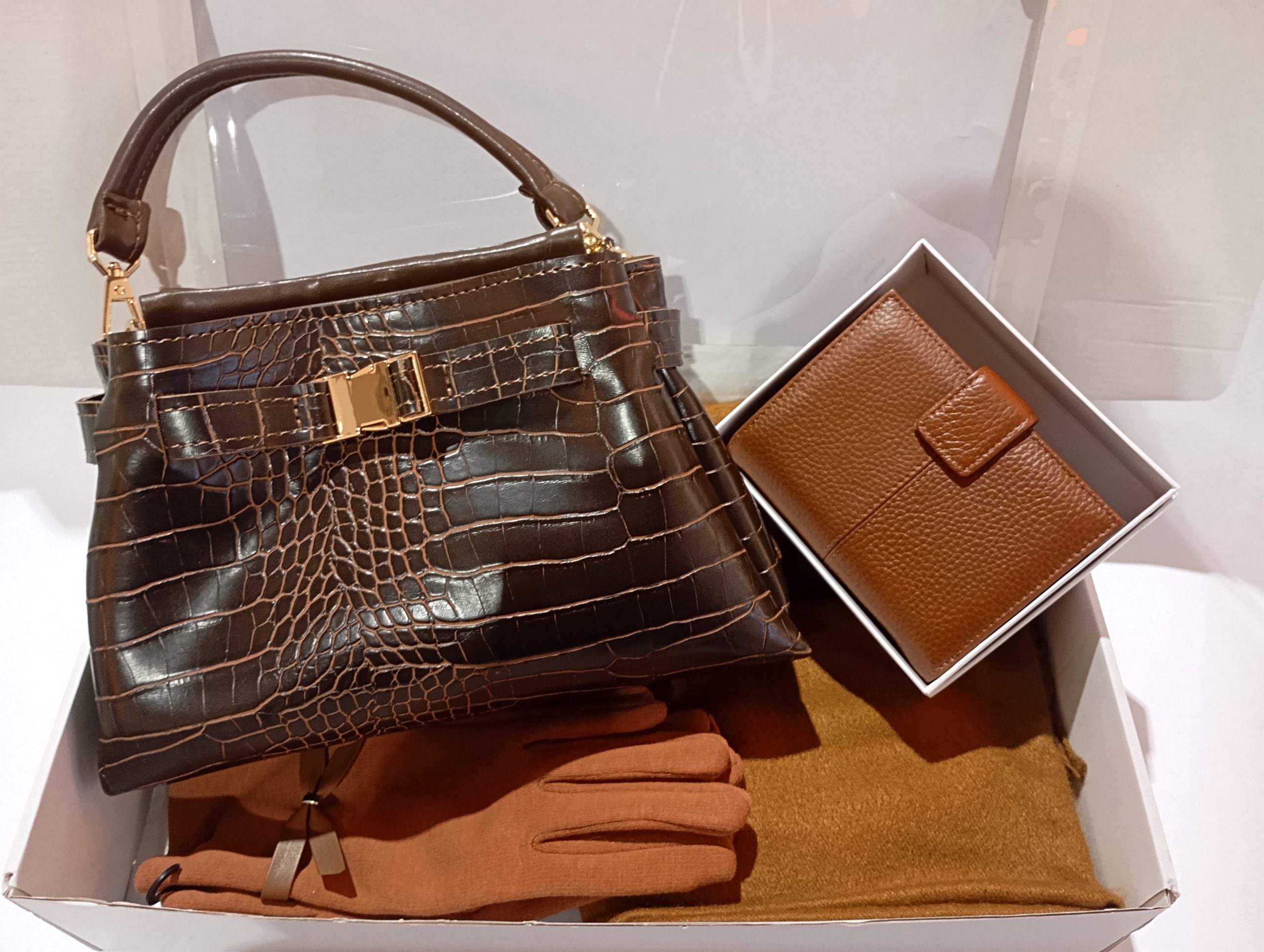 Poklon se se sastoji od:torbe, rukavica, šal , novčanik, poklon kutija